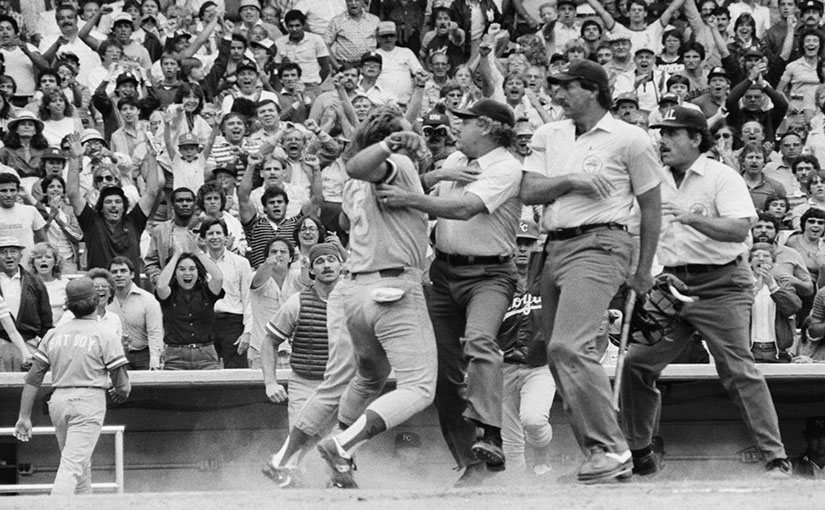 The Yankees held a 4-3 lead heading into the 9th thanks to RBI’s from Don Baylor and Dave Winfield. Prior to his final at-bat, Brett was 2-4 and now stood in the batters’ box facing Hall of Fame Yankee pitcher Goose Gossage. Teammate UL Washington was on base when Goose tried to throw a high heater by Brett, who promptly turned on it and hit it over the right field wall. And, well, then it got fun….